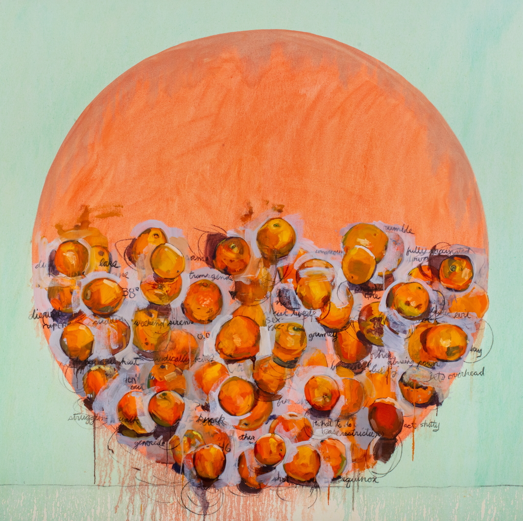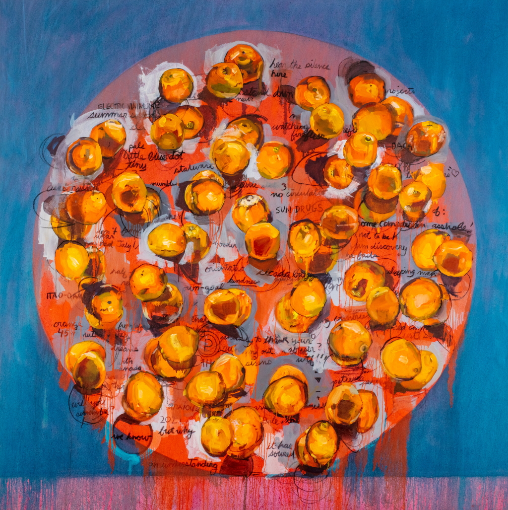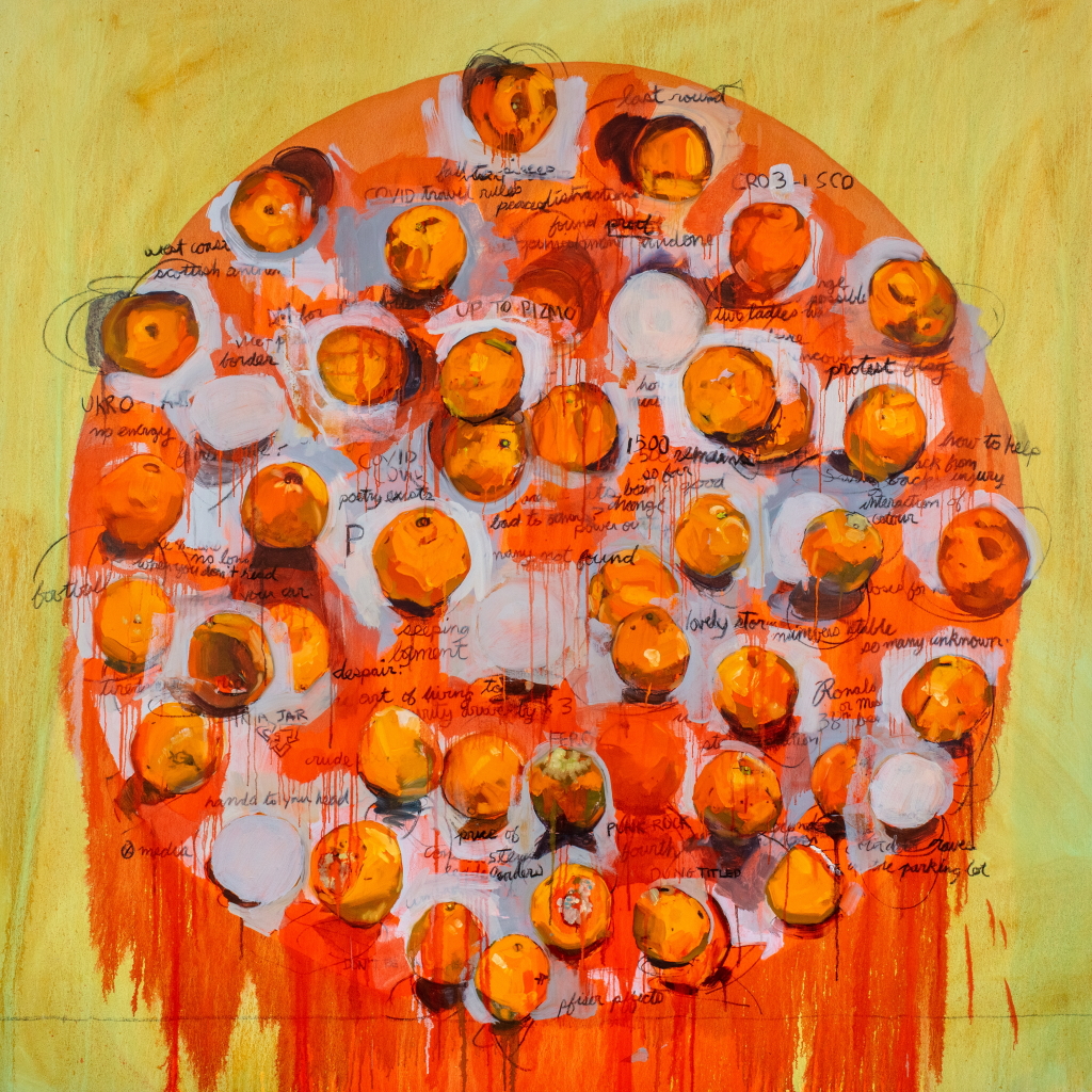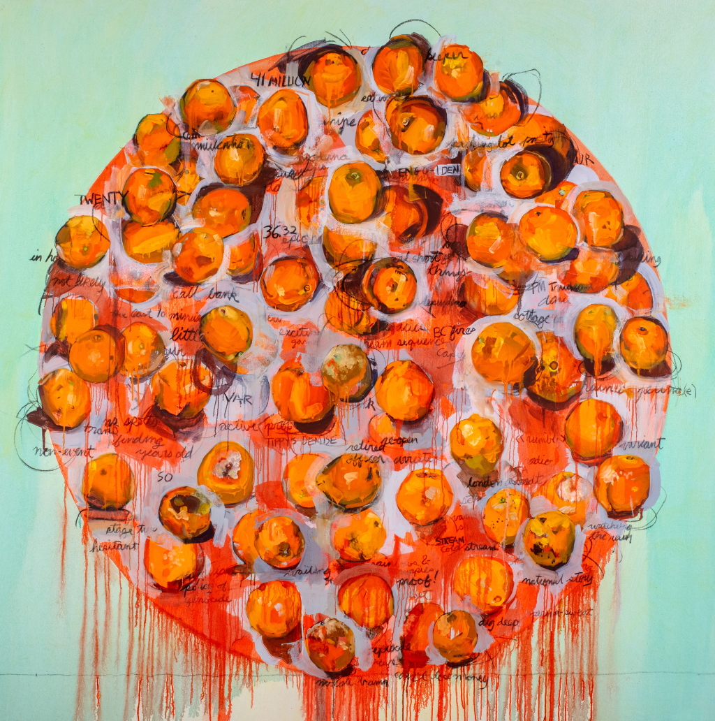For my MFA thesis, I presented a series of four paintings (oil on canvas, 70" × 70" [178.8 cm × 178.8 cm] each) that depict clusters of oranges and text fragments within a larger orange circle. Using the image of the orange in addition to text, this body of work explores concepts of resistance to mechanical time. Each painting functions as a container for a unit of time-one month. The orange is a marker for a single day. The text draws from disparate sources to give context to these markers. This exhibition represents four months, the approximate duration of the warm season in Ottawa. Through varying degrees of density and layering, the images of oranges and text explore how the flow of time varies with each month. Changes in viewpoint, light quality, shadow casts, and the interaction of layering of each orange acts as a clue to the process (the time of the making of the painting). Painting each orange one at a time, over a long period of time, layered and changed, overlayed with text from headlines, peripheral signage, song titles, and internal dialogues reinforces the concept of the painting as a vessel filled with time. These paintings evoke a willful resistance or dropping out of mechanical time exposing its artificiality.